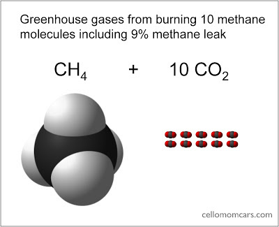 But if the gas came from the Utah field, the picture is less rosy: the 9% leak means that for every 10 methane molecules you burn into carbon dioxide, one escapes unconsumed. That one escaped methane molecule has the global warming potential (GWP) of 72 carbon dioxide molecules.